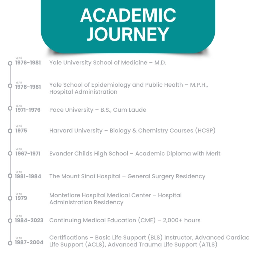 Dr. Donald E. Moore MD, MPH completed his early education at Evander Childs High School, earning an Academic Diploma with Merit in 1971. He graduated cum laude from Pace University with a B.S. in 1976 and took Biology and Chemistry courses at Harvard in 1975. He then earned an M.D. from Yale University School of Medicine in 1981 and simultaneously completed an M.P.H. in Hospital Administration at Yale School of Epidemiology and Public Health. He furthered his medical training with a General Surgery Residency at The Mount Sinai Hospital (1981-1984) and a Hospital Administration Residency at Montefiore Hospital Medical Center in 1979. Dr. Moore became board certified in emergency medicine in 1995, and over his career he accumulated over 2,000 hours of continuing medical education and held certifications in BLS, ACLS, and ATLS from 1987 to 2004.